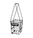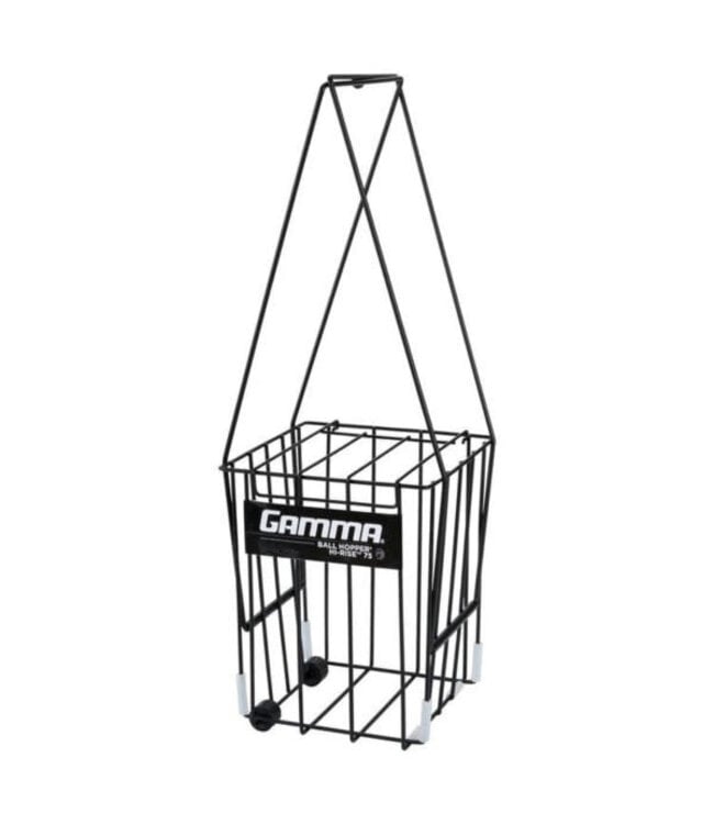 Basket holds 75 yellow tennis balls. Handles become legs and stands up for convenient feeding or serve practice. With handled collapsed, the hopper is used to pick up balls on the court.