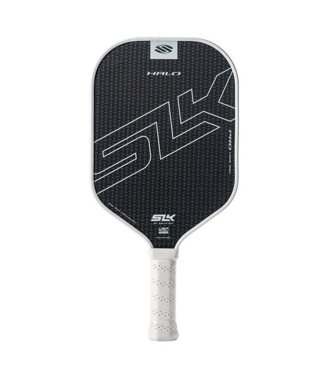 The SLK HALO Pro's resilient raw carbon kevlar surface improves spin, and its large sweet spot and lighter weight enhance maneuverability, allowing for powerful drives, speed ups, and put-aways with control at the net, solidifying it as the pinnacle of craftsmanship and performance within the HALO series of paddles.