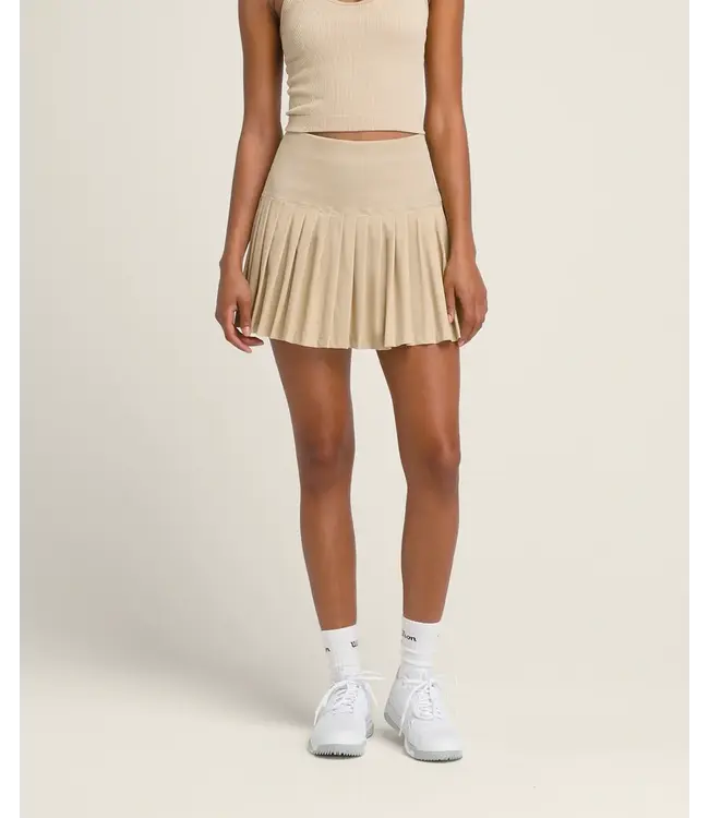 A century in tennis has brought us here, taking a simple thing and making it better. The Midtown Skirt is our riff on a traditional tennis skirt, a seamless interior short with a pleated skirt overlay. Wear it to play tennis, or do more -- with UV protection, unique fabric and multi-functional design. The inner short, which is upper-thigh length, has a storage pocket and our proprietary tiered compression waistband provides a perfect fit.